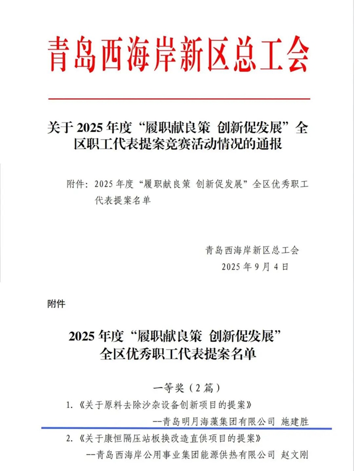 近日,在青島西海岸新區(qū)總工會主辦的“履職獻良策 創(chuàng)新促發(fā)展”職工代表提案競賽中,明月海藻集團提報的《關于原料去除沙雜設備創(chuàng)新項目的提案》從23件優(yōu)秀提案中脫穎而出,榮獲大賽最高獎項一等獎!
